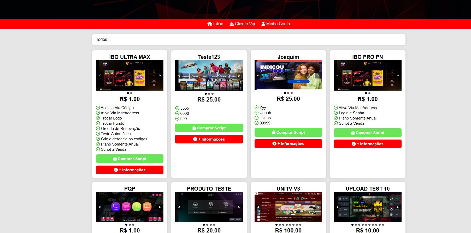 A CMD STORE oferece uma plataforma inovadora para aluguel de scripts, sites personalizados, aplicativos, webplayers e gestores de IPTV. Nosso sistema permite que você alugue essas ferramentas de forma rápida e prática, sem precisar desenvolver do zero. Com as nossas soluções, você tem acesso a recursos de alta qualidade, todos integrados e adaptados às suas necessidades, garantindo uma experiência fluida para você e seus clientes.